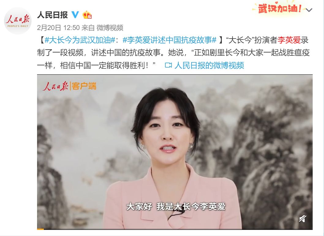 她曾为中国抗击疫情,特别录制了加油鼓劲的视频。