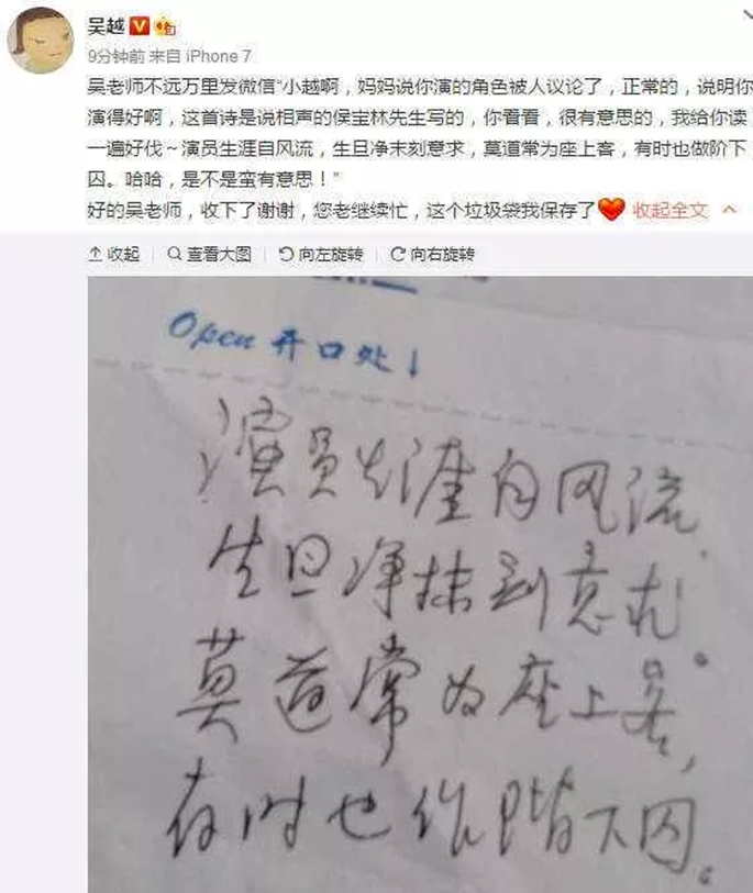 得知女儿因“凌玲”的角色被骂上热搜时,父亲正在高铁上,顺手拿起清洁袋,在空白面写下相声大师侯宝林的打油诗,拍照发给她。