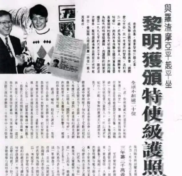 联合国还特地向他颁发了联合国护照,一般只授予全球作出卓越贡献的人,全球华人只有三人拥有联合国护照——马云、李连杰和黎明。