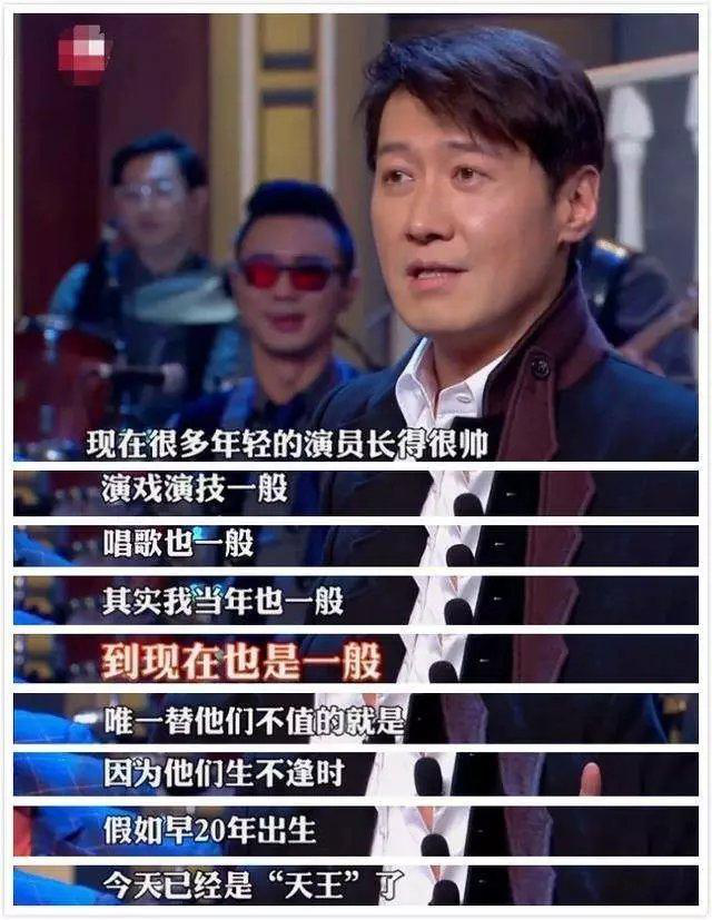 在接受金星(点击可查看)采访时,他说:“现在很多年轻演员长得帅,演戏演技一般,唱歌也一般,其实我当年也一般,到现在也一般。如果他们早20年出生,今天已经是天王了。”