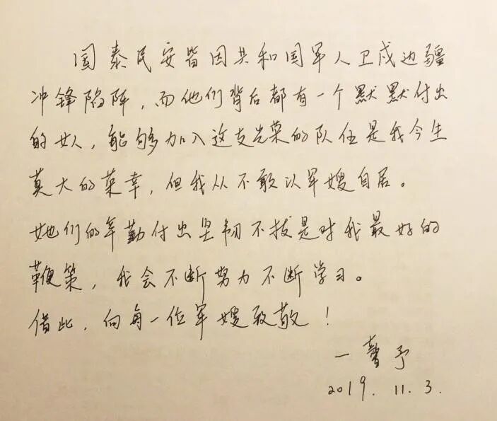 而她却谦虚地回应不敢以军嫂自居,并附上手写的小作文,致敬所有军嫂,诚意满满。