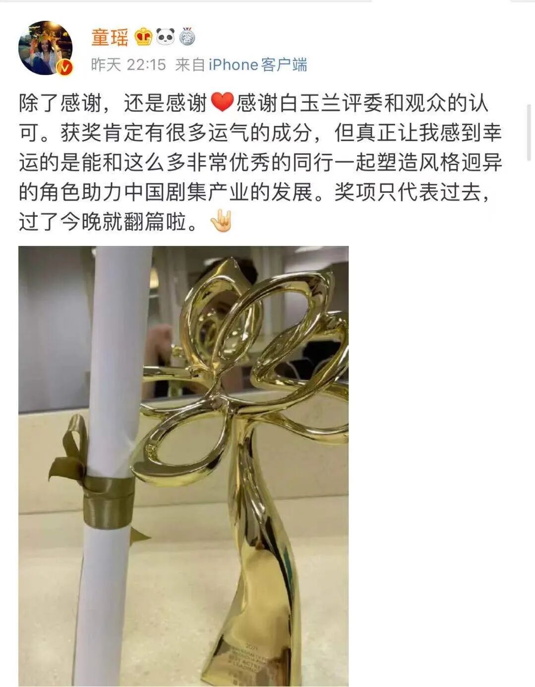 面对部分网友的讶异,童瑶发微博表示:“获奖肯定有很多运气的成分……奖项只代表过去,过了今晚就翻篇啦。”