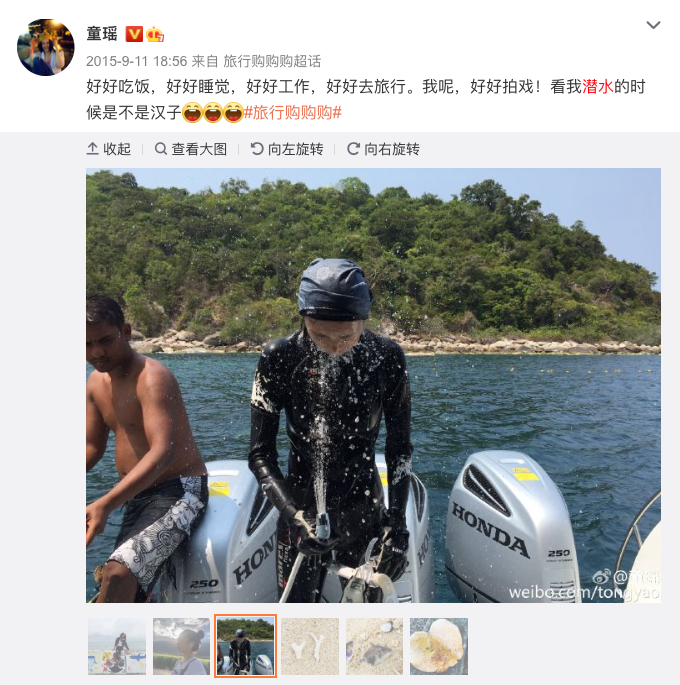 2014年,她在马来西亚学习了潜水。童瑶说,如果哪一天她不做演员了,她可能会去找一个岛,办一个潜水学校,当一名潜水教练。