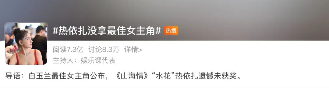 当晚,在一片“意难平”的声音中,#热依扎没拿最佳女主角#、#热依扎 你的福气在后头#等几个话题连续冲上热搜榜,引爆了讨论的焦点。