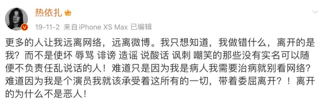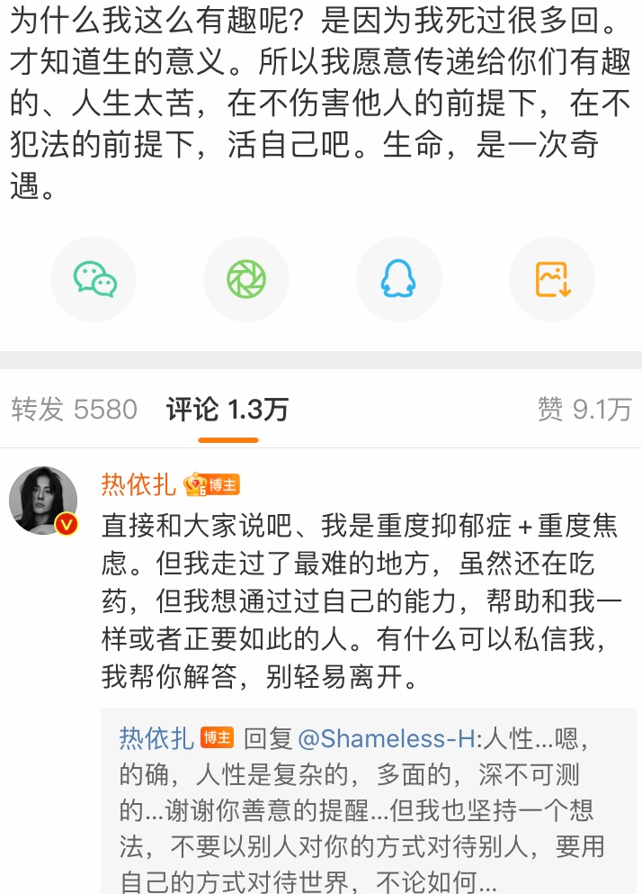2019年,热依扎选择在微博上公开这段经历,她说自己“死过很多回,才知道生的意义”。