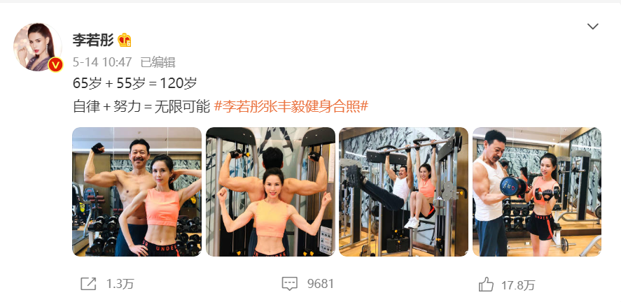 5月14日,55岁李若彤(点击可查看)曾在微博上晒出与65岁张丰毅的同框健身照,瞬间火上热搜。