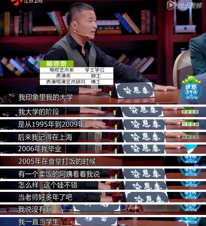 用喻恩泰自己的话说:“我读大学的时候,我侄女读小学,我侄女读大学了,我的大学还没毕业。”