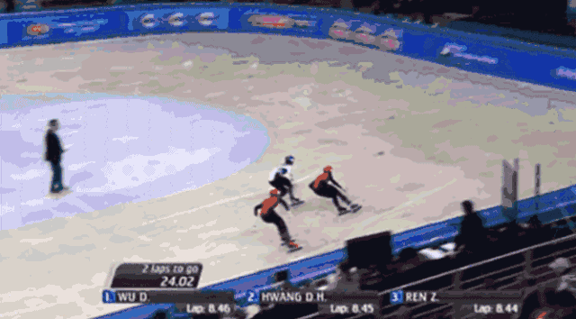 2019年世锦赛男子500米决赛上,一路领滑的武大靖被韩国选手“意外”带倒,两人双双摔出赛道。