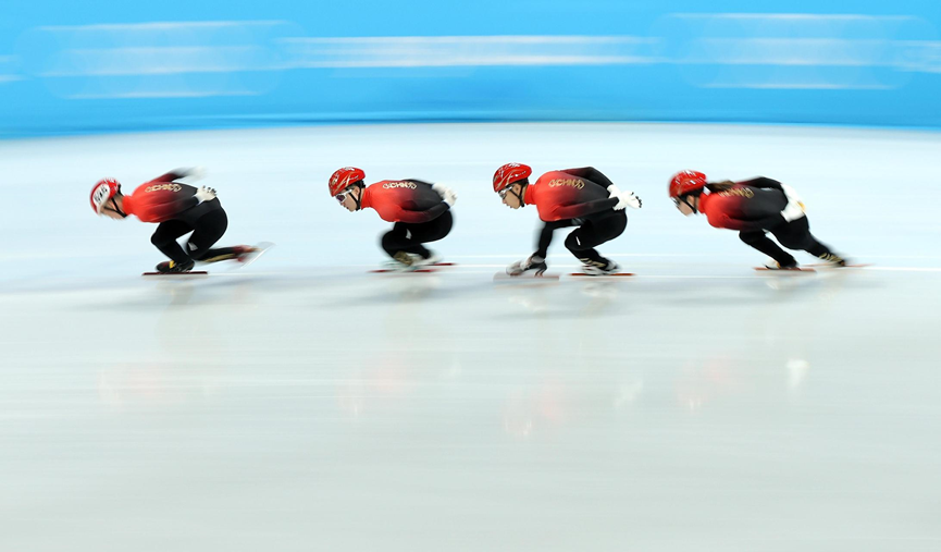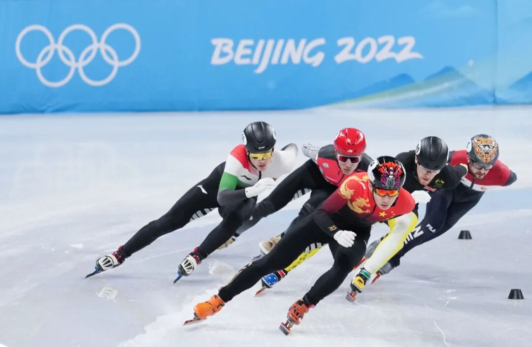 2022年冬奥会短道速滑项目男子1000米四分之一决赛武大靖助任子威领先