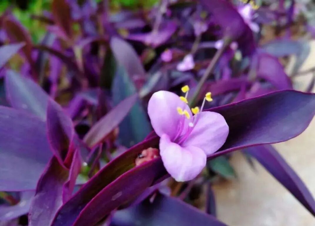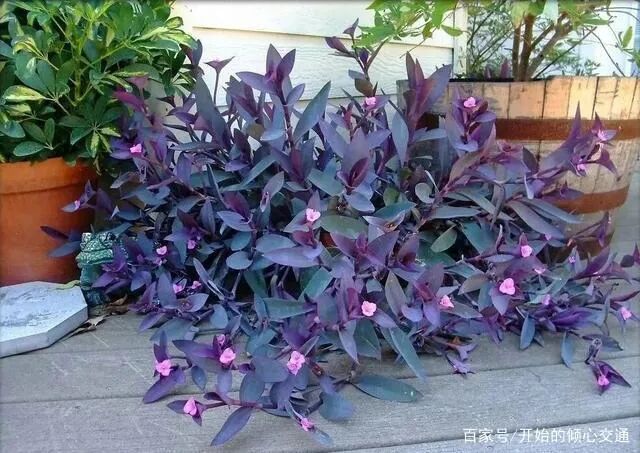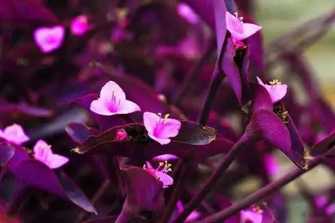紫竹梅,又叫紫鸭跖草,紫竹兰,多年生草本植物,通体深紫色,开粉白色花,是一种难得的紫色彩叶植物。