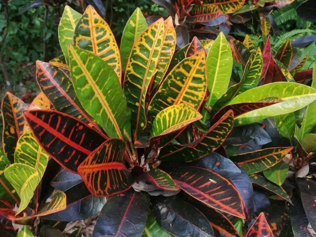 变叶木,一种常绿小灌木或小乔木,叶色也是很丰富,有绿色,淡绿色,黄色,紫红色,紫红和黄色相间等颜色,是庭院中常用的观叶品种。