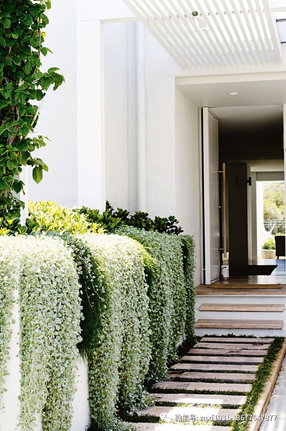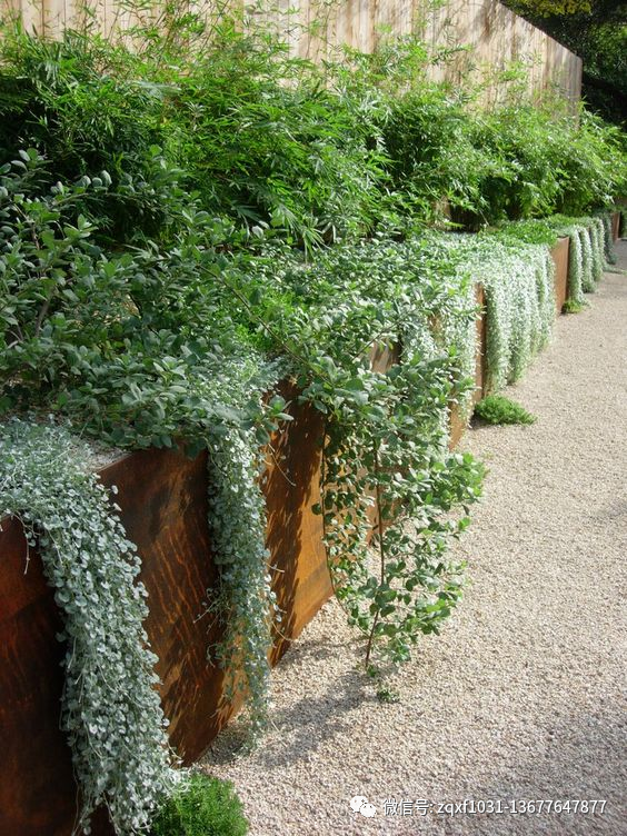 我们可以在矮墙和花池上面的土壤里种点可以垂吊下来的植物,就可以弱化这些墙面的生硬感,让墙面也可以变得很漂亮。