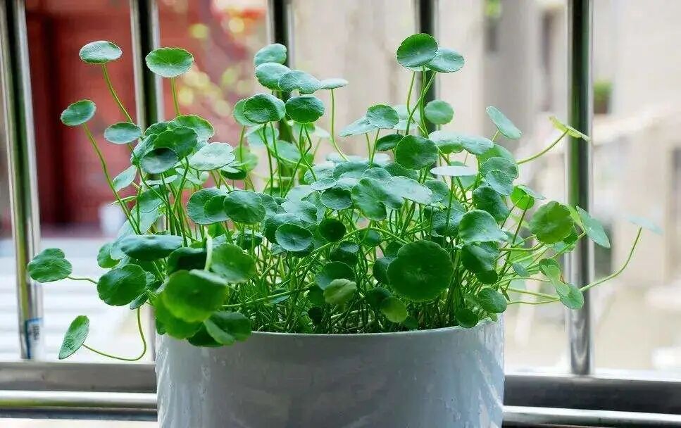 铜钱草,叶圆形盾状,如一枚铜钱,具长柄、波浪缘,夏秋开小小的黄绿色花。一节一节,每一节各长一枚叶,可一直延伸,是一种既美观又很好养的水生植物之一。铜钱草生性强健,种植容易,繁殖迅速,水陆两栖皆可。铜钱草性喜温暖潮湿,应该放在半阴处养护,忌阳光直射,栽培的土壤不限,以松软排水良好的栽培土为佳,或用水直接栽培。铜钱草尤其在夏季生长速度更快,不注意浇水,就会出现整个植株叶片耷拉、发黄情况,严重的时候,整株都会死亡。