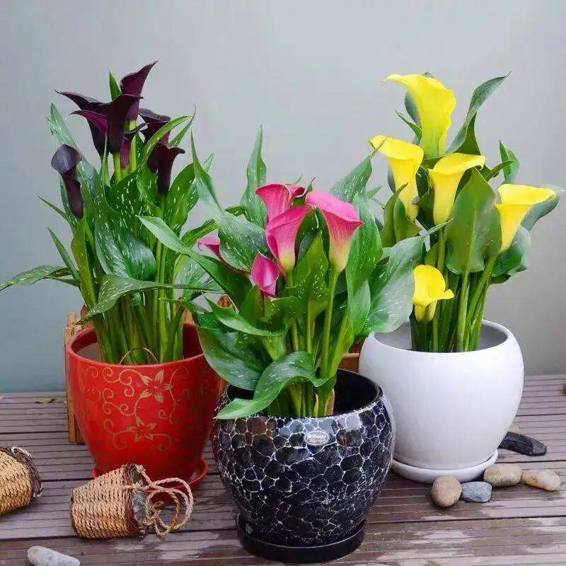 马蹄莲是非常常见的鲜切花,花型美丽大方,植株挺拔秀气,花苞雅致迷人,还有很多彩色品种,绚丽多姿,花叶两绝,非常漂亮。马蹄莲喜欢湿润的生长环境,缺水容易枯死,可以半水半土栽培养护,盆里先倒入一半的原土,将马蹄莲栽种进去,倒入清水,放在阴凉通风处,服盆后,再放在日光充足的地方。每月施肥1-2次,很快就可以花开爆盆。