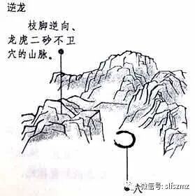 逆龙,是对那些耸起的星峰侧向而立,伸出的枝脚逆向而趋,行度乖张违物的龙脉的称谓。《入式歌》曰:“逆自望后去。”大致来说,这种龙脉自从离开祖山以来,山峦的高低上下没有条理,行进的前后方向没有规律,行龙度脉之处枝脚并不相随,入穴之处龙虎二山并不侍卫左右,如同水流逆行、鸬鹚倒飞一样,肆意散漫背弃龙脉。这样的龙脉最为凶险,即使有形式上的穴场,也是兆示不吉的穴场,预示着家族成员凶暴忤逆,成为盗寇配军。也有一边顺一边逆的,子微所说的“一种半逆半顺行,多为反戟祸不轻。长幼吉凶分左右,悖逆爷娘身受刑”,就是这种情况。所以“逆龙”结成的穴场,切不可下葬。