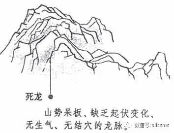 死龙,是对那些耸起的峰峦形状模糊,分出的枝脚态势不明,本身形体直挺僵硬的龙脉的称谓。《入式歌》说:“死是无起伏。”大致来说,这种龙脉自从离开祖山以来,就形体粗顽臃肿,既无纵向的起伏,也无横向的摆折,其态势如同离开水的鱼,没有枝条的树木,顺水漂流,如同死掉的泥鳅、鳝鱼,都没有生意。这种格局的龙脉最为凶险,不能融结成穴场,即使有形式上的穴场,也一定是虚假的融结。如果错误地下葬于此,兆示着家族成员穷苦下贱,甚至死绝。即使做神坛社庙,里面的神仙也不会显灵。