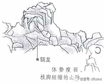 弱龙,是对那些耸起的星峰瘦削甚至露出石骨石头,伸出的枝脚也短小萎缩,体绵长柔缓的龙脉的称谓。《入式歌》说:“弱是瘦崚嶒。”大致来说,这种龙脉自从离开祖山以来,山势就飘飘散散,全无收敛聚拢之意,山峦险峻嵯峨,甚至露出石骨石头,体形则尖小懒缓,歪斜没有依靠,塌陷消瘦而不饱满,虚浮而没有光彩。形态如同鹅头鸭颈、残花败柳,气势如同趴伏在马厩里的饿马、失群孤飞的大雁一样,怯弱歪斜摇摆。这种龙脉大多遭受风吹水劫,不能融结成穴场,即使有形式上的穴场,也一定是虚假的融结。如果错误地下葬于此,预示着家族成员孤贫伶仃,疾苦困弱。