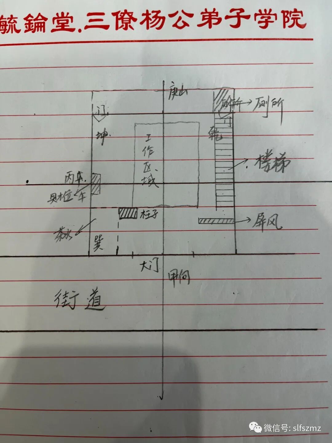 店面是坐庚山甲向,我在生方——乾方给他布置斜楼梯,在另外一个生方——丙午方布置财位,可以放鱼缸也可以放流水摆件。一楼喝茶的地方布置在旺方——巽方,中间部分用于员工工作的地方,刚好楼梯可以挡住厕所,其实厕所也在乾方,虽然不好,但是也不好改动,毕竟这个是房东的,另外,在楼梯前面布局一个屏风挡住这个上下的斜楼梯。