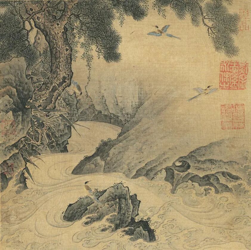 “时鸣春涧中”,月出、鸟惊、时鸣,在同一瞬发生。王维抓住这一瞬,就像在时间身上挖了个洞,并将它定格在空间中。这时,我们才听见溪涧的流水,它们被鸟鸣从睡梦中全部吵醒。