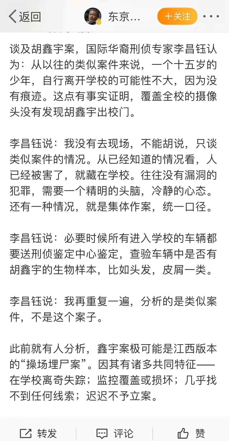 李昌钰认为,像胡鑫宇这样的校园失踪案,取证的关键是校园内的监控录像、校门口的录像是否显示事发时有车辆进出、学校围墙的高度、墙上是否留有蛛丝马迹、失踪者的手机、失踪前跟谁联系过,这些都需要重点关注。