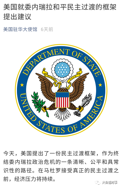 从美国驻华使馆,特意在国内社交网站发布要马杜罗下台的声明,再到国内社交网站出现马杜罗投降的谣言。