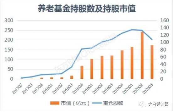 截止去年第三季度,养老金所持重仓股为108家企业,持流通股市值为174.26亿元。