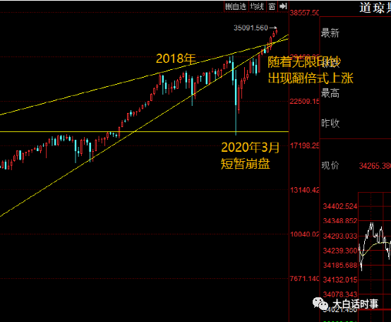 然后就是去年3月份因为疫情导致美国出现流动性危机,股市一度崩盘35%,但随着美联储无限印钞大放水,一口气印钞3万亿美元,美股出现短短一年就出现翻倍式涨幅的极端走势。