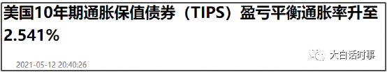 截止5月12日的数据,美国的盈亏平衡通胀率是升至了2.541%,这是2013年以来的最高水平。