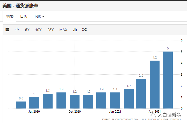 美国也只用了3个月的时间,通货膨胀率就从1.7%的低通胀位置,暴涨到现在5%的高通胀位置。