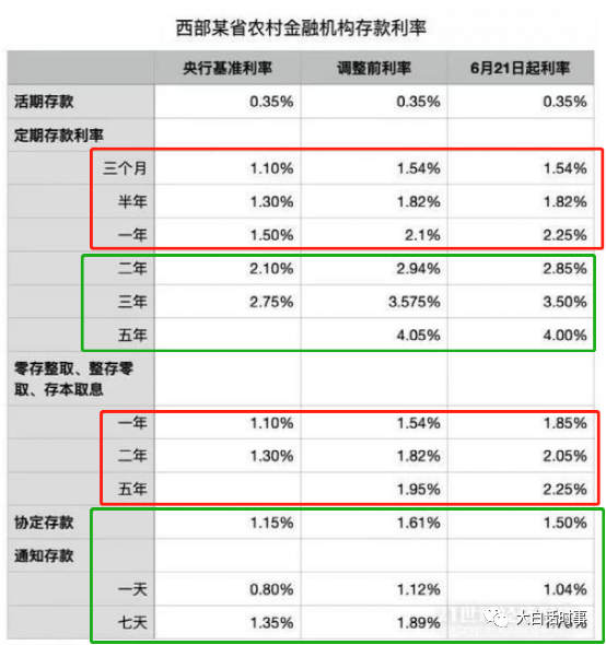 新模式利率下降的存款产品,用绿色框选起来。