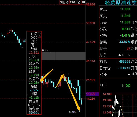 但在昨天这个WTI原油6月合约,也一度暴跌到6.47美元。