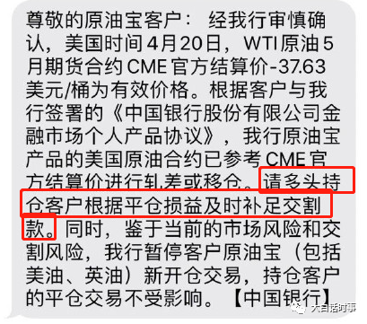 网络上今天流传的原油宝客户收到的中行短信通知如下: