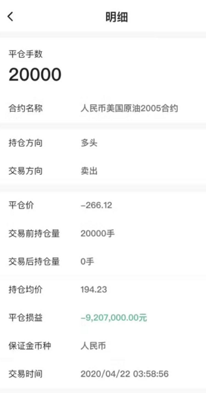 由于客户不能交易后,油价一路暴跌,银行也没有按照保证金低于20%就自动强制平仓,而是眼睁睁看着客户账户资金急剧缩水,乃至开始倒欠钱了,一直等到收盘最后一刻,才参与最后结算价格。