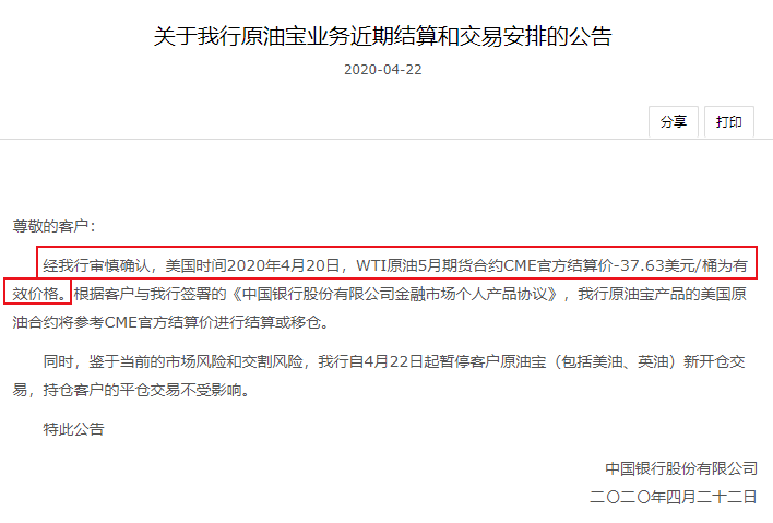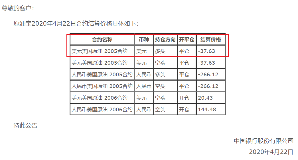 但今天中行公告的结算价,却是按照21日凌晨2点半的最终结算价,也就是负的37美元去做结算。