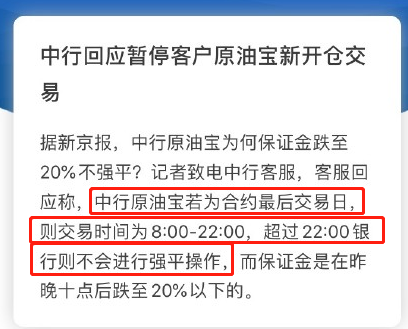 理论上,即使中行在20日晚上22点停止客户交易,那么也应该在22点之后当油价暴跌,客户保证金已经不足20%的情况下,中行也应该立即强制帮客户平仓,而不是非要等到油价跌成负数,最后一刻才参与成交。