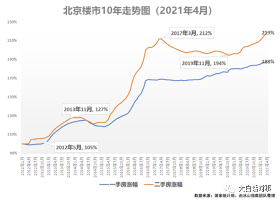 北京房价在2017年之后,整体一直处于持续回落的状态,一直到去年疫情之后,才开始重新上涨,但整体仍然跟2017年高点差不多的状态。