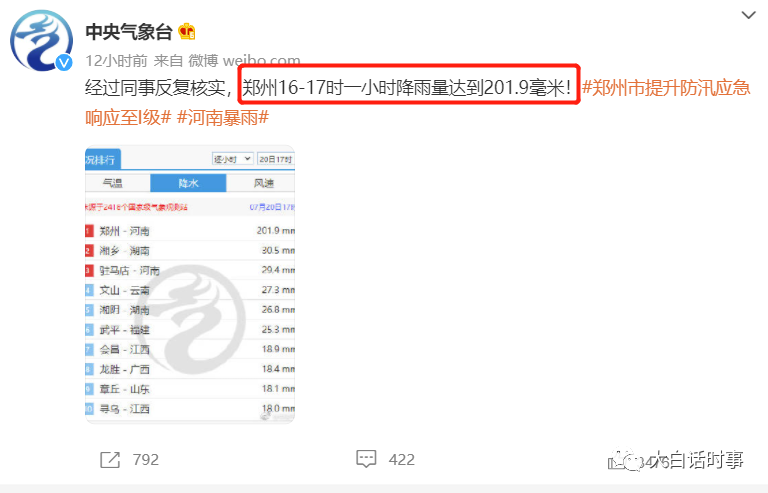 虽然不贴视频和受灾图片,但我们可以看一组数据,就更能知道这次河南的暴雨灾害到底有多恐怖和极端。