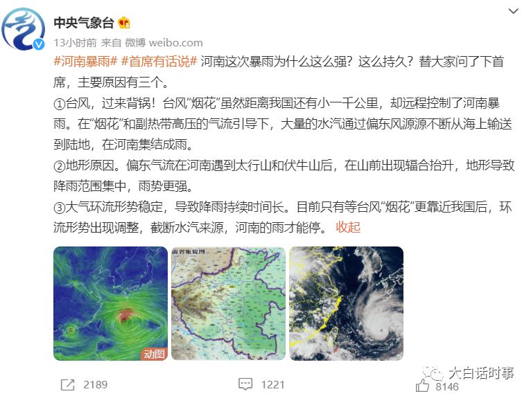 同时,中央气象台还分析认为“大气环流形势稳定,导致降雨持续时间长。目前只有等台风“烟花”更靠近我国后,环流形势出现调整,截断水汽来源,河南的雨才能停。”