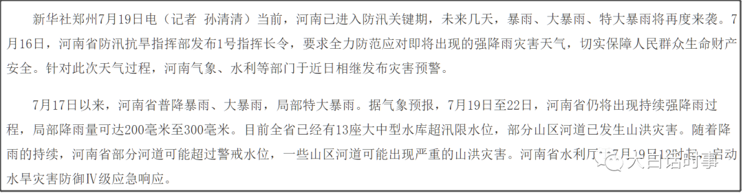 1、其实在7月19日,河南多部门已经发布了灾害预警。