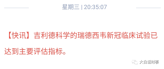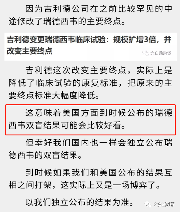 还是我之前说的,关于瑞德西韦,如果美国的临床结果和中国的临床结果有出入,请相信我们自己的临床结果,至少我们不是利益相关方。