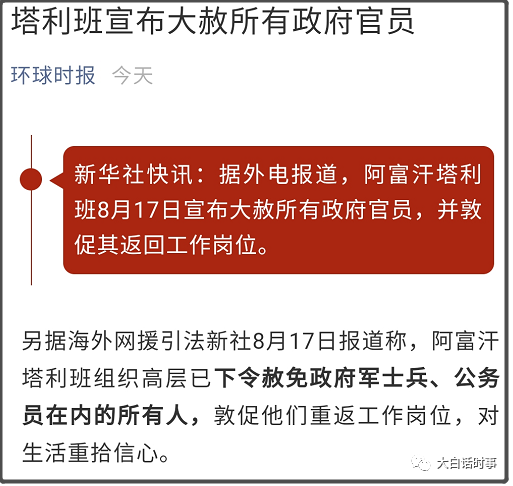 也就是原来的政府军士兵、公务员,包括那些为美军“流过血、出过力”的阿富汗人,都可以被大赦。