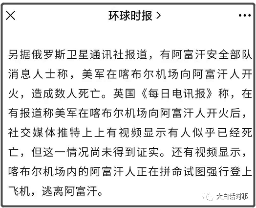 根据俄罗斯卫星通讯社报道,阿富汗安全部队消息人士称,美军在喀布尔机场向阿富汗人开火,造成数人死亡。