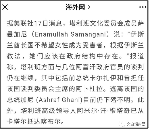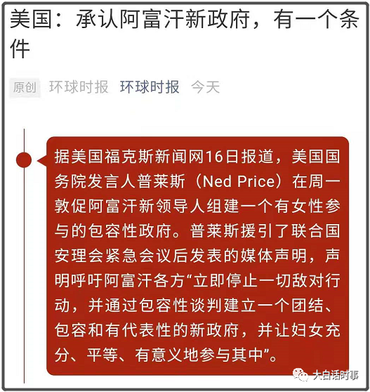 有意思的是,随后没多久,美国发言人就公开表示,美国将承认阿富汗潜在新政府,但有一个前提条件是,阿富汗新政府“维护权利、不窝藏恐怖分子、保护妇女和女孩的权利”。