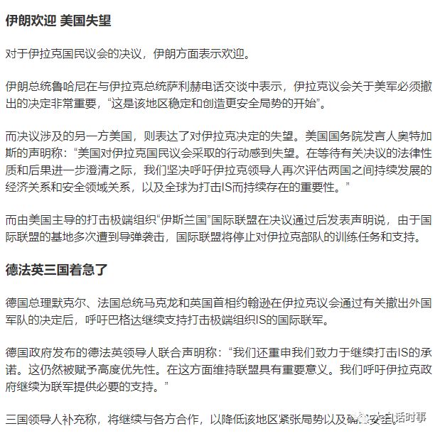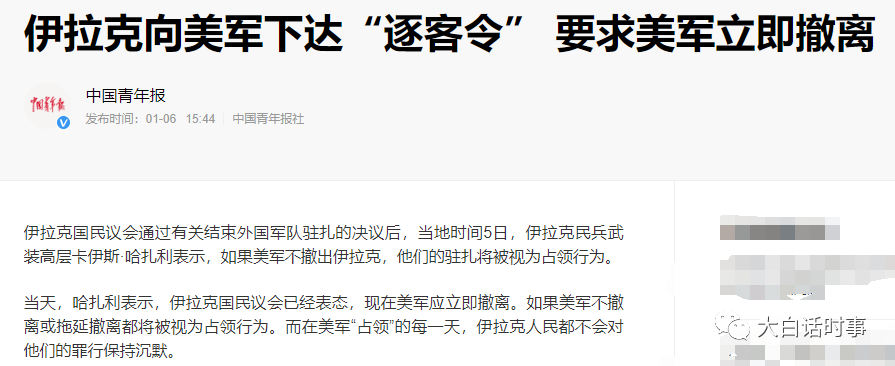 在骚扰行为之外,伊朗首先施加自己对伊拉克的影响力,于是伊拉克在昨晚半夜宣布要让所有外国军队立即撤出伊拉克。