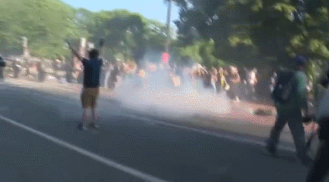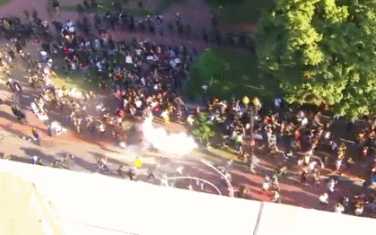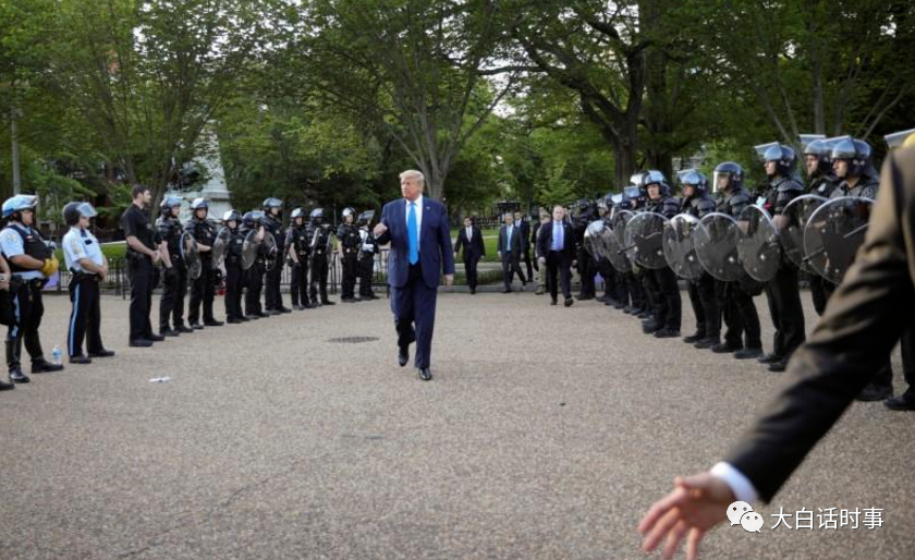 不过比较讽刺的是,特朗普靠特勤人员和催泪弹清出一条道后,特朗普躲在特勤人员背后冠冕堂皇的讲话的同时,一街之外的示威者和美国警察的冲突则同时上演。