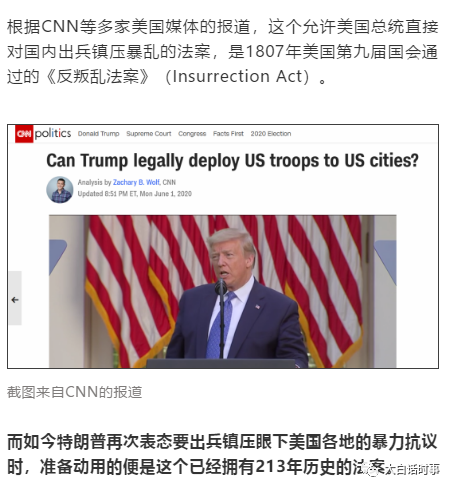 特朗普这样做的权利来自于1807年美国通过的《反叛乱法》,所以实际上这意味着特朗普已经把当前国内的暴力骚乱当作叛乱来处理了。