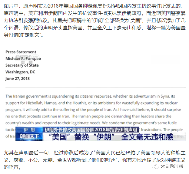 伊朗的修改方法很简单,就是把美国2018年的指责声明里的伊朗替换成美国,结果全文毫无违和感。