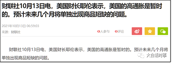 耶伦说“美国的高通胀是暂时的,同时预计未来几个月将出现商品短缺的问题”。