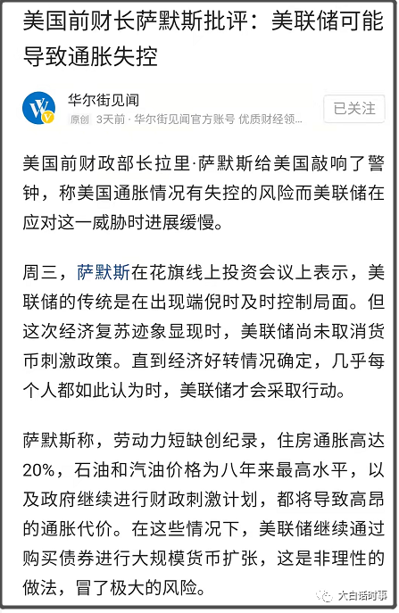 包括美国前财长也公开表示,美联储可能导致通胀失控。
