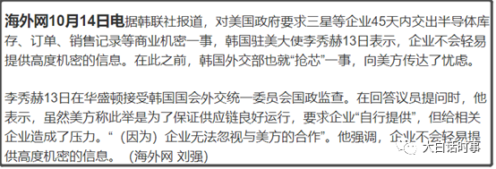 韩国方面在10月14日也表示,虽然美方称此举是为了保证供应链良好运行,要求企业“自行提供”,但给相关企业造成了压力。“(因为)企业无法忽视与美方的合作”,但企业不会轻易提供高度机密的信息。